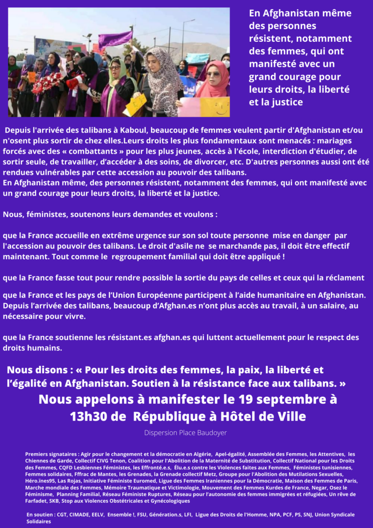 « POUR LES DROITS DES FEMMES, LA PAIX, LA LIBERTÉ ET L’ÉGALITÉ EN AFGHANISTAN, SOUTENONS LA RÉSISTANCE CONTRE LES TALIBANS »